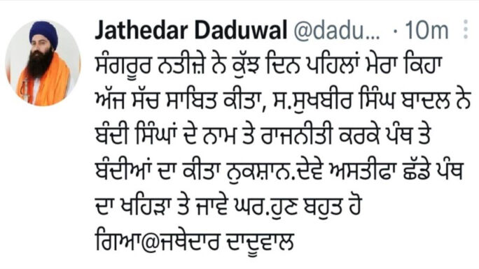 ਅੰਮ੍ਰਿਤਸਰ: ਹਰਿਆਣਾ ਸਿੱਖ ਗੁਰਦੁਆਰਾ ਪ੍ਰਬੰਧਕ ਕਮੇਟੀ ਦੇ ਪ੍ਰਧਾਨ ਬਾਬਾ ਬਲਜੀਤ ਸਿੰਘ ਦਾਦੂਵਾਲ ਨੇ ਸੰਗਰੂਰ ਜ਼ਿਮਨੀ ਚੋਣ ਦੇ ਨਤੀਜਿਆਂ ਨੂੰ ਦੇਖਦੇ ਹੋਇਆ ਸੋਸ਼ਲ ਮੀਡੀਆ ਤੇ ਪੋਸਟ ਵਾਇਰਲ ਕੀਤੀ ਹੈ।
