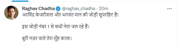 ਨਵੀਂ ਦਿੱਲੀ : -ਆਮ ਆਦਮੀ ਪਾਰਟੀ ਦੇ ਸਹਿ ਇੰਚਾਰਜ ਅਤੇ ਨਵੇਂ ਚੁਣੇ ਗਏ ਰਾਜ ਸਭਾ ਮੈਂਬਰ ਰਾਘਵ ਚੱਢਾ ਵਲੋਂ ਟਵੀਟ ਕੀਤਾ ਗਿਆ। ਟਵੀਟ ਕਰਦਿਆਂ ਉਨ੍ਹਾਂ ਕਿਹਾ ਕਿ ਅਰਵਿੰਦ ਕੇਜਰੀਵਾਲ ਅਤੇ ਭਗਵੰਤ ਮਾਨ ਦੀ ਜੋੜੀ ਸੁਪਰਹਿੱਟ ਹੈ। ਇਸ ਨੰਬਰ-1 ਜੋੜੀ ਤੋਂ ਸਾਰੇ ਨੇਤਾ ਸੜ ਰਹੇ ਹਨ। ਨਾਲ ਹੀ ਉਨ੍ਹਾਂ ਨੇ ਟਵੀਟ ਕਰਕੇ ਇਹ ਵੀ ਲਿਖਿਆ ਕਿ ਬੁਰੀ ਨਜ਼ਰ ਵਾਲੇ ਤੇਰਾ ਮੂੰਹ ਕਾਲਾ।