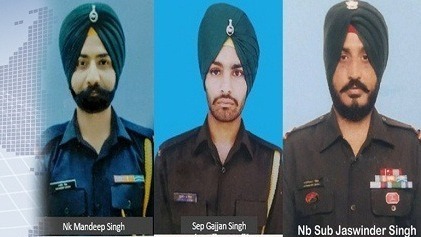 ਜੰਮੂ-ਕਸ਼ਮੀਰ ਦੇ ਪੁੰਛ ਵਿਚ ਅੱਤਵਾਦੀਆਂ ਨਾਲ ਮੁਕਾਬਲੇ ਦੌਰਾਨ ਪੰਜਾਬ ਦੇ 4 ਜਵਾਨ ਸ਼ਹੀਦ ਹੋਏ ਹਨ। ਇਸ ਮੁਠਭੇੜ ਵਿਚ ਪੰਜਾਬ ਦੇ ਜਿਲ੍ਹਾ ਰੂਪਨਗਰ ਦੇ ਪਿੰਡ ਪੱਚਰੰਡਾ ਦਾ ਜਵਾਨ ਗੱਜਣ ਸਿੰਘ ਸ਼ਹੀਦ ਹੋ ਗਿਆ।