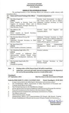 ਚੰਡੀਗੜ੍ਹ ਪੰਜਾਬ ਸਰਕਾਰ ਵੱਲੋਂ ਅੱਜ ਇਕੋ ਦਿਨ ਹੀ IAS ਅਤੇ PCS ਅਧਿਕਾਰੀਆਂ ਦੀ ਤੀਜੀ ਲਿਸਟ ਜਾਰੀ ਕਰਦੇ ਹੋਏ ਸ਼ਾਮ ਵੇਲੇ ਤੱਕ 3 ਆਈਏਐਸ ਅਤੇ 3 ਪੀਸੀਐਸ ਅਫਸਰਾਂ ਦੇ ਤਬਾਦਲੇ ਕੀਤੇ ਗਏ ਹਨ।