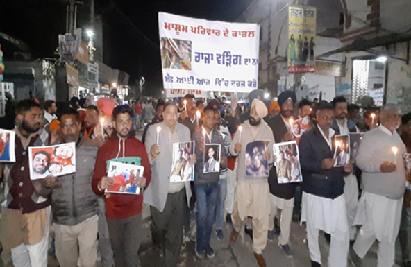ਸ਼੍ਰੀ ਮੁਕਤਸਰ ਸਾਹਿਬ (ਅਨਮੋਲ ਵੜਿੰਗ) : ਪਿਛਲੇ ਦਿਨੀਂ ਫਰੀਦਕੋਟ ਸ਼ਹਿਰ ਦੇ ਨਰਾਇਣ ਨਗਰ ਵਿਚ ਰਹਿੰਦੇ ਇਕ ਠੇਕੇਦਾਰ ਕਰਨ ਕਟਾਰੀਆ ਵਲੋਂ ਆਪਣੇ 2 ਮਾਸੂਮ ਬੱਚਿਆਂ ਅਤੇ ਪਤਨੀ ਨੂੰ ਗੋਲੀ ਮਾਰਨ ਤੋਂ ਬਾਅਦ ਖੁਦ ਨੂੰ ਵੀ ਗੋਲੀ ਮਾਰ ਕੇ ਖੁਦਕੁਸੀ ਕਰਨ ਦਾ ਮਾਮਲਾ ਸਾਹਮਣੇ ਆਇਆ ਸੀ । ਪ੍ਰਾਪਤ ਜਾਣਕਾਰੀ ਅਨੁਸਾਰ ਠੇਕੇਦਾਰ ਨੇ ਇਕ ਸੁਸਾਈਡ ਨੋਟ ਵੀ ਲਿਖਿਆ ਸੀ ਜਿਸ ਵਿੱਚ ਹਲਕਾ ਗਿੱਦੜਬਾਹਾ ਦੇ ਵਿਧਾਇਕ ਅਮਰਿੰਦਰ ਸਿੰਘ ਰਾਜਾ ਵੜਿੰਗ ਦੇ ਸਾਲੇ ਡੰਪੀ ਵਿਨਾਇਕ ਦਾ ਨਾਮ ਸਾਹਮਣੇ ਆਇਆ ਹੈ । ਸੋਮਵਾਰ ਦੀ ਦੇਰ ਸ਼ਾਮ ਹਲਕਾ ਗਿੱਦੜਬਾਹਾ ਵਿਖੇ ਸ੍ਰੋਮਣੀ ਅਕਾਲੀ ਦਲ ਵੱਲੋਂ ਹਲਕਾ ਇੰਚਾਰਜ ਹਰਦੀਪ ਸਿੰਘ ਡਿੰਪੀ ਢਿੱਲੋਂ ਦੀ ਅਗਵਾਈ ਵਿੱਚ ਠੇਕੇਦਾਰ ਕਰਨ ਕਟਾਰੀਆ ਉਸਦੀ ਪਤਨੀ ਅਤੇ ਉਸਦੇ ਬੱਚਿਆ ਦੀ ਆਤਮਿਕ ਸਾਂਤੀ ਲਈ ਸਾਰੇ ਸਹਿਰ ਵਿੱਚ ਕੈਡਲ ਕੱਢਿਆ ਗਿਆ ਅਤੇ ਕੈਡਲ ਮਾਰਚ ਸਮੇ ਹੱਥਾਂ ਵਿੱਚ ਫੜੇ ਬੈਨਰਾਂ ਤੇ ਰਾਜਾ ਵੜਿੰਗ ਨੂੰ ਇਸ ਮਾਮਲੇ ਵਿੱਚ ਸਾਮਿਲ ਕੀਤਾ ਜਾਵੇ ਅਤੇ ਫਾਂਸੀ ਦੀ ਸਜ਼ਾ ਦਿੱਤੀ ਜਾਵੇ। ਇਸ ਸਮੇ ਸਹਿਰ ਵਾਸੀਆ ਦੇ ਨਾਲ ਵੱਡੀ ਗਿਣਤੀ ਵਿੱਚ ਅਕਾਲੀ ਵਰਕਰ ਵੀ ਮੌਜੂਦ ਸਨ । ਇਸ ਸਮੇ ਹਰਦੀਪ ਸਿੰਘ ਡਿੰਪੀ ਢਿੱਲੋਂ ਨੇ ਪੱਤਰਕਾਰਾਂ ਨਾਲ ਗੱਲਬਾਤ ਕਰਦਿਆਂ ਕਿਹਾ ਕਿ ਅਮਰਿੰਦਰ ਸਿੰਘ ਰਾਜਾ ਵੜਿੰਗ ਦੇ ਸਾਲੇ ਨੇ ਮਰਨ ਵਾਲੇ ਠੇਕੇਦਾਰ ਤੋ 1 ਕਰੋੜ 22 ਲੱਖ ਰੁਪਏ ਲਏ ਸਨ ਅਤੇ ਜਦੋ ਠੇਕੇਦਾਰ ਨੇ ਆਪਣੇ ਪੈਸਿਆਂ ਦੀ ਮੰਗ ਕੀਤੀ ਤਾ ਰਾਜਾ ਵੜਿੰਗ ਦੇ ਸਾਲੇ ਡੰਪੀ ਵਿਨਾਇਕ ਨੇ ਉਸਦੇ ਪੈਸੇ ਦੇਣ ਤੋ ਸਾਫ ਮਨਾ ਕਰ ਦਿੱਤਾ ਜਿਸਦੇ ਚੱਲਦੇ ਠੇਕੇਦਾਰ ਵੱਲੋਂ ਮਜਬੂਰਨ ਇਹ ਕਦਮ ਚੁੱਕਣਾ ਪਇਆ। ਅਤੇ ਉਹਨਾਂ ਮੰਗ ਕੀਤੀ ਕੀ ਕਿ ਗਿੱਦੜਬਾਹਾ ਦੇ ਵਿਧਾਇਕ ਅਮਰਿੰਦਰ ਸਿੰਘ ਰਾਜਾ ਵੜਿੰਗ ਨੂੰ ਇਸ ਮਾਮਲੇ ਵਿੱਚ ਸਾਮਿਲ ਕੀਤਾ ਜਾਵੇ । ਅਤੇ ਪਰਿਵਾਰ ਨੂੰ ਇਨਸਾਫ਼ ਦਿਵਾਇਆ ਜਾਵੇ | ਉਹਨਾਂ ਕਿਹਾ ਕਿ ਡੰਪੀ ਵਿਨਾਇਕ ਜੋ ਕਿ ਵਿਧਾਇਕ ਅਮਰਿੰਦਰ ਸਿੰਘ ਰਾਜਾ ਵੜਿੰਗ ਦਾ ਸਾਲਾ ਹੈ ਉਹ ਤਾਂ ਸਿਰਫ ਪੈਸੇ ਇੱਕਠੇ ਕਰਨ ਵਾਲਾ ਹੈ ਜੋ ਅਸਲ ਮੁਲਜਮ ਹੈ ਉਹ ਗਿੱਦੜਬਾਹਾ ਦੇ ਵਿਧਾਇਕ ਨੇ ਇਹ ਮਾਰਚ ਅਸੀਂ ਸੁੱਤੀ ਹੋਈ ਸਰਕਾਰ ਨੂੰ ਜਗਾਉਣ ਲਈ ਕਢਿਆਂ ਹੈ ਕਿ ਇਹਨਾਂ ਨੂੰ ਦੋਨਾਂ ਨੂੰ ਫੜੇ ਅਤੇ ਡੰਪੀ ਵਿਨਾਇਕ ਤਾਂ ਇੱਕ ਜਰੀਆ ਹੈ ਜੋ ਕਿ ਐਮ.ਐਲ,ਏ ਵਾਸਤੇ ਪੈਸੇ ਇੱਕਠੇ ਕਰਕ ਉਸ ਨੂੰ ਦਿੰਦਾ ਜਿਸਦਾ ਕਿ ਨਾਮ ਪਰਚੇ ਵਿੱਚ ਪਾ ਕੇ ਵਿਧਾਇਕ ਨੂੰ ਇਸ ਕੇਸ ਵਿਚੋਂ ਕਢ ਲਿਆਂ ਗਿਆਂ ਹੈ