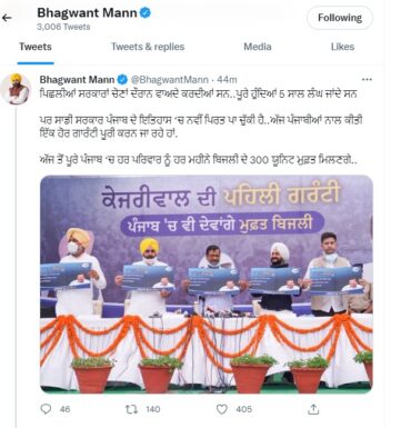 300 ਯੂਨਿਟ ਬਿਜਲੀ ਮੁਫ਼ਤ ਹੋਣ ‘ਤੇ ਮੁੱਖ ਮੰਤਰੀ ਭਗਵੰਤ ਮਾਨ ਦਾ ਟਵੀਟ