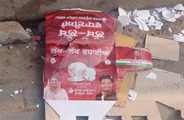 ਸ੍ਰੀ ਮੁਕਤਸਰ ਸਾਹਿਬ (ਅਨਮੋਲ ਵੜਿੰਗ) : ਸ੍ਰੀ ਮੁਕਤਸਰ ਸਾਹਿਬ ਨਗਰ ਕੌਂਸਲ ਦੇ ਵਾਰਡ ਨੰਬਰ 10 ਤੋਂ ਕਾਂਗਰਸੀ ਉਮੀਦਵਾਰ ਦੇ ਸਮਰਥਕ ਘਰ ਘਰ ਜਾ ਕੇ ਡਿਨਰ ਸੈਟ ਵੰਡ ਰਹੇ ਹਨ। ਡਿਨਰ ਸੈਟ ਤੇ ਆਸਰਾ ਫਾਊਂਡੇਸ਼ਨ ਲਿਖਿਆ ਲਗੀ ਹੈ ਰਾਜਾ ਵੜਿੰਗ ਅਤੇ ਉਸਦੀ ਪਤਨੀ ਅੰਮ੍ਰਿਤਾ ਵੜਿੰਗ ਦੀ ਫੋਟੋ।