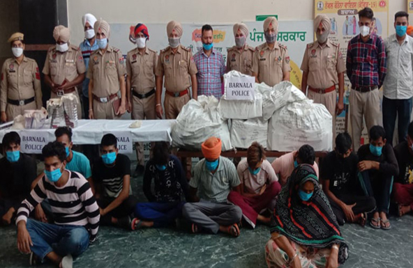 ਬਰਨਾਲਾ ( ਕਰਨਪ੍ਰੀਤ ਧੰਦਰਾਲ )-ਪੰਜਾਬ ਸਰਕਾਰ ਅਤੇ ਡੀ.ਜੀ.ਪੀ. ਪੰਜਾਬ ਦੇ ਦਿਸ਼ਾ ਨਿਰਦੇਸ਼ਾਂ ਅਨੁਸਾਰ ਸਮਾਜ ਵਿਰੋਧੀ ਅਨਸਰਾਂ ਅਤੇ ਨਸ਼ਾ ਤਸਕਰਾਂ ਖਿਲਾਫ਼ ਚਲਾਈ ਗਈ ਮੁਹਿੰਮ ਤਹਿਤ ਜ਼ਿਲ੍ਹਾ ਬਰਨਾਲਾ ਪੁਲਿਸ ਨੂੰ ਵੱਡੀ ਸਫ਼ਲਤਾ ਹਾਸਲ ਹੋਈ ਹੈ | ਜਿਸ ਦੇ ਤਹਿਤ ਪੁਲਿਸ ਵਲੋਂ ਨਸ਼ਾ ਵੇਚਣ ਵਾਲੇ ਅਤੇ ਲੁੱਟਾਂ-ਖੋਹਾਂ ਕਰਨ ਵਾਲੇ ਵੱਖ-ਵੱਖ ਗਿਰੋਹਾਂ ਦੇ 15 ਮੈਂਬਰਾਂ ਨੂੰ ਕਾਬੂ ਕਰ ਕੇ 950 ਗ੍ਰਾਮ ਚਿੱਟਾ, 2 ਲੱਖ 34 ਹਜ਼ਾਰ ਨਸ਼ੀਲੀਆਂ ਗੋਲੀਆਂ, ਦੋ ਗੱਡੀਆਂ, ਦੋ ਮੋਟਰਸਾਈਕਲ, 12 ਬੋਰ ਪਿਸਤੌਲ ਸਮੇਤ ਹੋਰ ਹਥਿਆਰ ਬਰਾਮਦ ਕੀਤੇ ਗਏ ਹਨ | ਪ੍ਰੈਸ ਕਾਨਫ਼ਰੰਸ ਦੌਰਾਨ ਜਾਣਕਾਰੀ ਦਿੰਦਿਆਂ ਜ਼ਿਲ੍ਹਾ ਪੁਲਿਸ ਮੁਖੀ ਸੰਦੀਪ ਗੋਇਲ ਨੇ ਦੱਸਿਆ ਕਿ ਕੁਝ ਵਿਅਕਤੀਆਂ ਨੇ ਇਕ ਵੱਡਾ ਗਿਰੋਹ ਬਣਾਇਆ ਹੋਇਆ ਹੈ ਜੋ ਬਾਹਰਲੇ ਸੂਬਿਆਂ ਵਿਚੋਂ ਨਸ਼ਾ ਲਿਆ ਕੇ ਵੇਚਣ ਦੇ ਆਦੀ ਹਨ | ਸੀ.ਆਈ.ਏ. ਸਟਾਫ਼ ਦੇ ਇੰਚਾਰਜ ਬਲਜੀਤ ਸਿੰਘ ਦੀ ਅਗਵਾਈ ਵਿਚ ਵੱਖਰੀ ਟੀਮ ਬਣਾਈ ਗਈ | ਜਿਨ੍ਹਾਂ ਨੇ ਨਾਕੇ ਦੌਰਾਨ ਨਵਜੋਤ ਸਿੰਘ ਜੋਤ ਪੁੱਤਰ ਮੇਜਰ ਸਿੰਘ ਵਾਸੀ ਸੈਦੋਵਾਲ, ਜਗਦੀਸ਼ ਸਿੰਘ ਜੱਗਾ ਜੋ ਕਾਰ ਪੀ.ਬੀ. 11 ਏ.ਡੀ. 2703, ਪੀ.ਬੀ. 13 ਬੀ.ਸੀ. 1133 ਗੱਡੀ ‘ਚ ਆ ਰਹੇ ਸਨ, ਕਾਰਾਂ ਦੀ ਤਲਾਸ਼ੀ ਲਈ ਗਈ ਤਾਂ ਕਾਰਾਂ ਵਿਚੋਂ 2 ਲੱਖ 20 ਹਜ਼ਾਰ ਨਸ਼ੀਲੀਆਂ ਗੋਲੀਆਂ ਬਰਾਮਦ ਕਰ ਕੇ ਇਨ੍ਹਾਂ ਨੂੰ ਗਿ੍ਫ਼ਤਾਰ ਕਰ ਲਿਆ ਗਿਆ | ਪੁੱਛਗਿਛ ਦੌਰਾਨ ਇਨ੍ਹਾਂ ਨੇ ਮੰਨਿਆ ਕਿ ਸੁਧੀਰ ਕੁਮਾਰ ਪਾਲ ਉਰਫ਼ ਰਵਿੰਦਰ ਪੁੱਤਰ ਸ਼ਿਵਜੀ ਪਾਲ ਵਾਸੀ ਭਵਾਨੀਪੁਰ ਭੇਜਾ (ਮਧੂਬਨੀ ਬਿਹਾਰ) ਹਾਲ ਆਬਾਦ ਸੋਨੀਆ ਬਿਹਾਰ ਨਵੀਂ ਦਿੱਲੀ, ਹਰਵਿੰਦਰ ਸਿੰਘ ਰਿੰਦਾ ਪੁੱਤਰ ਗੁਰਬਚਨ ਸਿੰਘ ਵਾਸੀ ਬਸਤੀ ਗੋਬਿੰਦ ਨਗਰ ਪਟਿਆਲਾ ਸਮਾਣਾ, ਮਨਦੀਪ ਸਿੰਘ ਮਿੱਠੂ ਵਾਸੀ ਬਿਜਲਪੁਰ (ਪਟਿਆਲਾ) ਨਾਲ ਕੰਮ ਕਰਦੇ ਹਨ | ਗਿ੍ਫ਼ਤਾਰ ਵਿਅਕਤੀਆਂ ਦੀ ਨਿਸ਼ਾਨਦੇਹੀ ‘ਤੇ ਇਨ੍ਹਾਂ ਵਿਅਕਤੀਆਂ ਨੂੰ ਵੀ ਗਿ੍ਫ਼ਤਾਰ ਕਰ ਕੇ ਮਾਮਲਾ ਦਰਜ ਕਰ ਕੇ ਅਗਲੀ ਕਾਰਵਾਈ ਸ਼ੁਰੂ ਕਰ ਦਿੱਤੀ | ਇਸੇ ਤਰ੍ਹਾਂ ਹੀ ਇਕ ਹੋਰ ਮਾਮਲੇ ਵਿਚ ਥਾਣੇਦਾਰ ਕੁਲਦੀਪ ਸਿੰਘ ਸੀ.ਆਈ.ਏ. ਸਟਾਫ਼ ਨੇ ਬੱਸ ਸਟੈਂਡ ਕਾਲੇਕੇ ਵਿਖੇ ਨਾਕਾ ਲਗਾਇਆ ਹੋਇਆ ਸੀ |