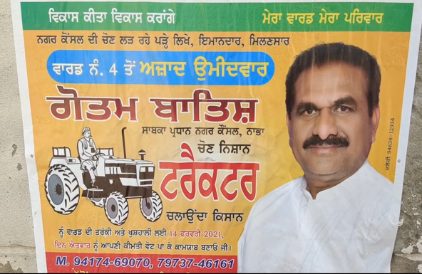 ਨਾਭਾ (ਸੁਖਚੈਨ ਲੁਬਾਣਾ) : ਨਾਭਾ ਨਗਰ ਕੌਂਸਲ ਚੋਣਾਂ ਨੂੰ ਲੈ ਕੇ ਸਿਆਸਤ ਪੂਰੀ ਤਰ੍ਹਾਂ ਭਖ ਚੁੱਕੀ ਹੈ ਅਤੇ ਅੱਜ ਆਖ਼ਰੀ ਦਿਨ ਹਰ ਉਮੀਦਵਾਰ ਵੱਲੋਂ ਪੂਰਾ ਜ਼ੋਰ ਲਗਾਇਆ ਜਾ ਰਿਹਾ । ਜਿਸ ਦੇ ਤਹਿਤ ਨਾਭਾ ਨਗਰ ਕੌਂਸਲ ਦੇ ਸਾਬਕਾ ਪ੍ਰਧਾਨ ਅਤੇ ਕਾਂਗਰਸ ਪਾਰਟੀ ਦੇ ਬਲਾਕ ਪ੍ਰਧਾਨ ਗੌਤਮ ਬਾਤਿਸ਼ ਨੂੰ ਕਾਂਗਰਸ ਪਾਰਟੀ ਵੱਲੋਂ ਟਿਕਟ ਨਾ ਜਾਣ ਤੇ ਉਨ੍ਹਾਂ ਵੱਲੋਂ ਆਜ਼ਾਦ ਤੌਰ ਤੇ ਚੋਣ ਮੈਦਾਨ ਵਿਚ ਉਤਰ ਕੇ ਅੱਜ ਰੋਡ ਸ਼ੋਅ ਕੀਤਾ ਗਿਆ ਅਤੇ ਆਪਣੀ ਜਿੱਤ ਦੀ ਦਾਅਵੇਦਾਰੀ ਠੋਕੀ ਗਈ ਇਸ ਮੌਕੇ ਰੋਡ ਸ਼ੋਅ ਵਿੱਚ ਵੱਡੀ ਗਿਣਤੀ ਵਿੱਚ ਵਾਰਡ ਵਾਸੀ ਮੌਜੂਦ ਰਹੇ।