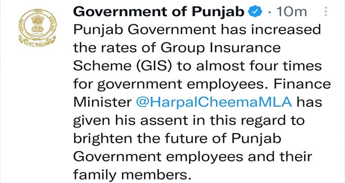 ਬੁਢਲਾਡਾ, 27 ਮਈ ਖ਼ਜ਼ਾਨਾ ਮੰਤਰੀ ਹਰਪਾਲ ਸਿੰਘ ਚੀਮਾ ਦੀ ਸਹਿਮਤੀ ਤੋਂ ਬਾਅਦ ਪੰਜਾਬ ਸਰਕਾਰ ਨੇ ਆਪਣੇ ਮੁਲਾਜ਼ਮਾਂ ਦੀ ਗਰੁੱਪ ਬੀਮਾ ਸਕੀਮ (ਜੀ. ਆਈ .ਐਸ.) ਦੀ ਅਦਾਇਗੀ ਵਿਚ ਚਾਰ ਗੁਣਾਂ ਵਾਧਾ ਕਰ ਦਿੱਤਾ ਹੈ। ਜਾਣਕਾਰੀ ਅਨੁਸਾਰ 1990 ਤੋਂ ਗਰੁੱਪ ਬੀਮਾ ਸਕੀਮ ਦੀਆਂ ਦਰਾਂ ਨੂੰ ਸੋਧਿਆ ਨਹੀਂ ਗਿਆ ਸੀ ਅਤੇ ਹੁਣ ਪੇਅ ਕਮਿਸ਼ਨ ਲਾਗੂ ਹੋਣ ਤੋਂ ਬਾਅਦ ਮੁਲਾਜ਼ਮਾਂ ਦੀਆਂ ਵਧੀਆ ਤਨਖ਼ਾਹਾਂ ਕਰਕੇ ਇਹ ਫ਼ੈਸਲਾ ਲਿਆ ਗਿਆ ਹੈ। ਪਹਿਲਾਂ ਕਿਸੇ ਕਰਮਚਾਰੀ ਦੀ ਸਰਕਾਰੀ ਸੇਵਾ ਦੌਰਾਨ ਮੌਤ ਹੋ ਜਾਣ ਜਾਂ ਸੇਵਾ ਮੁਕਤੀ ਸਮੇਂ ਉਸ ਨੂੰ 15 ਹਜ਼ਾਰ ਰੁਪਏ ਤੋਂ 1.20 ਲੱਖ ਰੁਪਏ ਦੀ ਅਦਾਇਗੀ ਕੀਤੀ ਜਾਂਦੀ ਸੀ ਜੋ ਕਿ ਹੁਣ 60 ਹਜ਼ਾਰ ਰੁਪਏ ਤੋਂ 4.80 ਲੱਖ ਰੁਪਏ ਕਰ ਦਿੱਤੀ ਗਈ ਹੈ। ਇਹ ਸਕੀਮ 1 ਜਨਵਰੀ, 2023 ਤੋਂ ਲਾਗੂ ਹੋਵੇਗੀ।