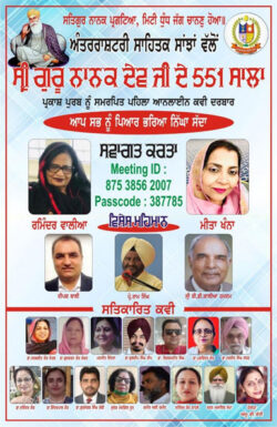 ਅੰਤਰਰਾਸ਼ਟਰੀ ਸਾਹਿਤਕ ਸਾਂਝਾ ਵੱਲੋਂ ਸ੍ਰੀ ਗੁਰੂ ਨਾਨਕ ਦੇਵ ਜੀ ਦੇ 551 ਸਾਲਾ ਪ੍ਰਕਾਸ਼ ਪੁਰਬ ਨੂੰ ਸਮਰਪਿਤ ਆਨ ਲਾਈਨ ਕਵੀ ਦਰਬਾਰ ਬੇਹੱਦ ਸਫਲ ਰਿਹਾ