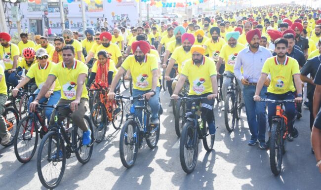 ਪੰਜਾਬ ਦੇ ਮੁੱਖ ਮੰਤਰੀ ਭਗਵੰਤ ਮਾਨ ਨੇ ਐਤਵਾਰ ਨੂੰ 15,000 ਤੋਂ ਵੱਧ ਸਾਈਕਲ ਸਵਾਰਾਂ ਦੀ ਅਗਵਾਈ ਕਰਦਿਆਂ ਸਥਾਨਕ ਜੀਜੀਐਸ ਸਕੂਲ ਦੇ ਗਰਾਊਂਡ ਤੋਂ ਇੱਕ ਵਿਸ਼ਾਲ ਨਸ਼ਾ ਵਿਰੋਧੀ ਜਾਗਰੂਕਤਾ ਸਾਈਕਲ ਰੈਲੀ ਕੀਤੀ।