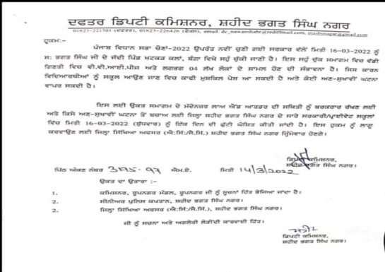 ਸ਼ਹੀਦ ਭਗਤ ਸਿੰਘ ਨਗਰ ਜ਼ਿਲ੍ਹੇ ਦੇ ਸਕੂਲਾਂ ਵਿਚ 16 ਮਾਰਚ ਨੂੰ ਛੁੱਟੀ ਦਾ ਐਲਾਨ