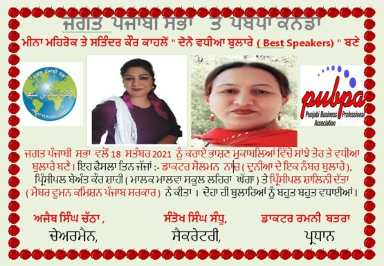 ਜਗਤ ਪੰਜਾਬੀ ਸਭਾ ਅਤੇ ਪਬਪਾ ਕੈਨੇਡਾ ਵੱਲੋਂ ਸਰਦਾਰ ਅਜੈਬ ਸਿੰਘ ਚੱਠਾ ਜੀ ਦੀ ਪ੍ਰਧਾਨਗੀ ਹੇਠ 18 ਸਤੰਬਰ 2021 ਨੂੰ “ਕਾਇਦਾ-ਏ- ਨੂਰ” ਵਿਸ਼ੇ ਤੇ ਕਰਵਾਏ ਗਏ ਅੰਤਰ-ਰਾਸ਼ਟਰੀ ਭਾਸ਼ਣ ਮੁਕਾਬਲੇ ਵਿੱਚ ਮੀਨਾ ਮਹਿਰੋਕ ਅਤੇ ਡਾ ਸਤਿੰਦਰ ਕੌਰ ਕਾਹਲੋਂ ਵਧੀਆ ਬੁਲਾਰੇ ਘੋਸ਼ਿਤ ਕੀਤੇ ਗਏ। ਇਹ ਮੁਕਾਬਲੇ ਜ਼ੂਮ ਐਪ ਰਾਹੀਂ ਕਰਵਾਏ ਗਏ ਜਿਸ ਵਿੱਚ 11 ਪ੍ਰਤੀਯੋਗੀਆਂ ਦੇਵ ਸਿੱਧੂ,ਮੀਨਾ ਮਹਿਰੋਕ,ਡਾ ਸਤਿੰਦਰ ਕੌਰ ਕਾਹਲੋਂ,ਸੁਰਜੀਤ ਕੌਰ,ਮੀਤਾ ਖੰਨਾ,ਡਾ ਵੀਰਪਾਲ ਕੌਰ, ਅਰਵਿੰਦਰ ਢਿੱਲੋਂ,ਡਾ ਸਾਇਮਾ ਬਤੂਲ, ਡਾ ਨੈਬ ਮੁੰਡੇਰ,ਰਣਜੀਤ ਬਾਜਵਾ ਨੇ ਹਿੱਸਾ ਲਿਆ । ਇਸ ਮੁਕਾਬਲੇ ਵਿੱਚ ਵਿਸ਼ੇਸ਼ ਮਹਿਮਾਨਾਂ ਵਜੋਂ , ਹਰਪ੍ਰੀਤ ਸਿੰਘ ਦਰਦੀ, ਡਾ ਰਮਨੀ ਬਤਰਾ,ਸਰਦੂਲ ਸਿੰਘ ਥਿਆੜਾ ਜੀ ਨੇ ਉਚੇਚੇ ਤੌਰ ਤੇ ਹਾਜ਼ਰੀ ਲਗਵਾਈ। ਪ੍ਰੋਗਰਾਮ ਦਾ ਸੰਚਾਲਨ ਸੰਤੋਖ ਸਿੰਘ ਸੰਧੂ ਨੇ ਬਾਖੂਬੀ ਨਿਭਾਇਆ। ਇਸ ਮੁਕਾਬਲੇ ਵਿੱਚ ਤਿੰਨ ਜੱਜਾਂ ਡਾ ਸੋਲਮਨ ਨਾਜ਼ (ਦੁਨੀਆਂ ਦੇ ਇੱਕ ਨੰਬਰ ਬੁਲਾਰੇ),ਪ੍ਰਿੰਸੀਪਲ ਬੇਅੰਤ ਕੌਰ ਸ਼ਾਹੀ(ਮਾਲਕ ਮਾਲਵਾ ਸਕੂਲ ਲਹਿਰਾਂ ਘੱਘਾ,ਪ੍ਰਿੰਸੀਪਲ ਸ਼ਾਲਿਨੀ ਦੱਤਾ (ਮੈਂਬਰ ਵੋਮੈਨ ਕਮਿਸ਼ਨ ਪੰਜਾਬ ਸਰਕਾਰ) ਨੇ ਆਪਣੀ ਪਾਰਖੂ ਨਜ਼ਰ ਨਾਲ ਮੁਕਾਬਲੇ ਦਾ ਫੈਸਲਾ ਪੇਸ਼ ਕੀਤਾ । ਕੁੱਲ ਮਿਲਾ ਕੇ “ਕਾਇਦਾ-ਏ-ਨੂਰ” ਵਿਸ਼ੇ ਤੇ ਕਰਵਾਇਆ ਗਿਆ ਇਹ ਮੁਕਾਬਲਾ ਬਹੁਤ ਸਾਰਥਕ ਸਿੱਧ ਹੋਇਆ।