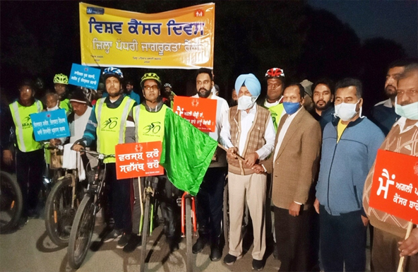 ਮਾਨਸਾ (ਗੁਰਜੰਟ ਸਿੰਘ ਬਾਜੇਵਾਲੀਆ) : ਸਿਹਤ ਵਿਭਾਗ ਮਾਨਸਾ ਵੱਲੋਂ ਵਿਸ਼ਵ ਕੈਂਸਰ ਦਿਵਸ ਮੌਕੇ ਇਕ ਜਾਗਰੂਕਤਾ ਸਾਇਕਲ ਰੈਲੀ ਕੱਢੀ ਗਈ, ਹਲਕਾ ਵਿਧਾਇਕ ਮਾਨਸਾ ਸ਼੍ਰੀ ਨਾਜ਼ਰ ਸਿੰਘ ਮਾਨਸਾਹੀਆ ਅਤੇ ਡਿਪਟੀ ਕਮਿਸ਼ਨਰ ਸ੍ਰੀ ਮਹਿੰਦਰ ਪਾਲ ਗੁਪਤਾ ਡਿਪਟੀ ਕਮਿਸ਼ਨਰ ਮਾਨਸਾ ਵੱਲੋਂ ਹਰੀ ਝੰਡੀ ਦੇ ਕੇ ਰਵਾਨਾ ਕੀਤਾ ਗਿਆ।ਇਸ ਸਾਇਕਲ ਰੈਲੀ ਵਿੱਚ ਮਾਨਸਾ ਸਾਇਕਲ ਗਰੁੱਪ ਅਤੇ ਈਕੋ ਵਹੀਲਰ ਸਾਇਕਲ ਗਰੁੱਪ ਦੇ ਮੈਂਬਰਾਂ ਨੇ ਭਾਗ ਲਿਆ।