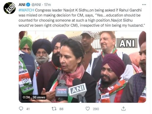 ਅੰਮ੍ਰਿਤਸਰ, 8 ਫਰਵਰੀ – ਕਾਂਗਰਸ ਨੇਤਾ ਨਵਜੋਤ ਕੌਰ ਸਿੱਧੂ ਨੂੰ ਇਹ ਪੁੱਛੇ ਜਾਣ ‘ਤੇ ਕਿ ”ਕੀ ਰਾਹੁਲ ਗਾਂਧੀ ਨੂੰ ਮੁੱਖ ਮੰਤਰੀ ਦਾ ਫ਼ੈਸਲਾ ਲੈਣ ‘ਤੇ ਗੁੰਮਰਾਹ ਕੀਤਾ ਗਿਆ ਸੀ ਤਾਂ ਉਨ੍ਹਾਂ ਨੇ ਇਸ ਦਾ ਜਵਾਬ ਹਾਂ ਵਿਚ ਦਿੱਤਾ ਅਤੇ ਕਿਹਾ ਕਿ ਅਜਿਹੇ ਉੱਚ ਅਹੁਦੇ ‘ਤੇ ਕਿਸੇ ਨੂੰ ਚੁਣਨ ਲਈ ਸਿੱਖਿਆ ਨੂੰ ਗਿਣਿਆਂ ਜਾਣਾ ਚਾਹੀਦਾ ਹੈ। ਉਨ੍ਹਾਂ ਦਾ ਕਹਿਣਾ ਸੀ ਕਿ ਨਵਜੋਤ ਸਿੰਘ ਸਿੱਧੂ ਮੁੱਖ ਮੰਤਰੀ ਚਿਹਰੇ ਲਈ ਸਹੀ ਚੋਣ ਹੋਣੀ ਸੀ |