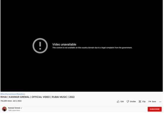 Rihai Song: ਮਰਹੂਮ ਗਾਇਕ ਸਿੱਧੂ ਮੂਸੇਵਾਲਾ ਦੇ ਗਾਣੇ ‘ਤੇ ਬੈਨ ਤੋਂ ਬਾਅਦ ਹੁਣ ਗਾਇਕ ਕੰਵਰ ਗਰੇਵਾਲ ਦੇ ‘ਰਿਹਾਈ’ ਗਾਣੇ ‘ਤੇ ਬੈਨ ਲਗਾ ਦਿੱਤਾ ਗਿਆ ਹੈ। ਯੂਟਿਊਬ ਵੱਲੋਂ ਭਾਰਤ ‘ਚ ਇਹ ਗਾਣਾ ਬੈਨ ਕਰ ਦਿੱਤਾ ਗਿਆ ਹੈ। ਇਸ ਗਾਣੇ ‘ਚ ਬੰਦੀ ਸਿੰਘਾਂ ਦੀ ਰਿਹਾਈ ਦੀ ਗੱਲ ਆਖੀ ਗਈ ਹੈ ਅਤੇ ਭਾਰਤ ਸਰਕਾਰ ਵੱਲੋਂ ਕਾਨੂੰਨੀ ਸ਼ਿਕਾਇਤ ਤੋਂ ਬਾਅਦ ਇਹ ਕਾਰਵਾਈ ਕੀਤੀ ਗਈ ਹੈ। ਦਸ ਦਈਏ ਕਿ ਇਸ ਤੋਂ ਪਹਿਲਾਂ ਗਾਇਕ ਸਿੱਧੂ ਮੂਸੇਵਾਲਾ ਦੇ ਗਾਣੇ SYL ‘ਤੇ ਪਾਬੰਦੀ ਲਾਈ ਗਈ ਸੀ। ਇਸ ਗਾਣੇ ਵਿੱਚ ਹਰਿਆਣਾ ਤੇ ਪੰਜਾਬ ਵਿੱਚ ਸਤਲੁਜ ਯਮੁਨਾ ਲਿੰਕ ਨਹਿਰ ਦੇ ਪਾਣੀ ਨੂੰ ਲੈ ਕੇ ਚੱਲ ਰਹੇ ਵਿਵਾਦ ਨੂੰ ਉਠਾਇਆ ਗਿਆ ਸੀ। ਦੇਸ਼ ਵਿਦੇਸ਼ ‘ਚ ਮਨੁੱਖਤਾ ਦੀ ਸੇਵਾ ਕਰਨ ਵਾਲੀ ਸੰਸਥਾ ਖਾਲਸਾ ਏਡ ਦੇ ਸੰਸਥਾਪਕ ਰਵੀ ਸਿੰਘ ਖਾਲਸਾ ਦਾ ਟਵਿਟਰ ਆਊਂਟ ਵੀ ਭਾਰਤ ‘ਚ ਬੈਨ ਕਰ ਦਿੱਤਾ ਗਿਆ ਹੈ । ਫੇਸਬੁੱਕ ‘ਤੇ ਪੋਸਟ ਸ਼ੇਅਰ ਕਰਕੇ ਉਹਨਾਂ ਨੇ ਭਾਜਪਾ ‘ਤੇ ਨਿਸ਼ਾਨਾ ਸਾਧਿਆ ਸੀ।