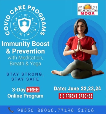 ਮੋਗਾ (ਹੈਪੀ-ਹਰਪਾਲ) : ਕਰੋਨਾ ਮਹਾਂਮਾਰੀ ਨਾਲ ਲੜ੍ਹਨ ਵਿੱਚ ਸਾਹ ਪ੍ਰਕਿਰਿਆ, ਮੈਡੀਟੇਸ਼ਨ ਅਤੇ ਯੋਗ ਦੀ ਮਹੱਤਤਾ ਬਾਰੇ ਜਾਣਕਾਰੀ ਦੇਣ ਲਈ ਜ਼ਿਲ੍ਹਾ ਪ੍ਰਸ਼ਾਸ਼ਨ ਵੱਲੋਂ ਵਿਸ਼ੇਸ਼ ਆਨਲਾਈਨ ਕੋਵਿਡ ਕੇਅਰ ਪ੍ਰੋਗਰਾਮ ਦਾ ਆਯੋਜਨ 22, 23 ਅਤੇ 24 ਜੂਨ ਨੂੰ ਕਰਵਾਇਆ ਜਾ ਰਿਹਾ ਹੈ।