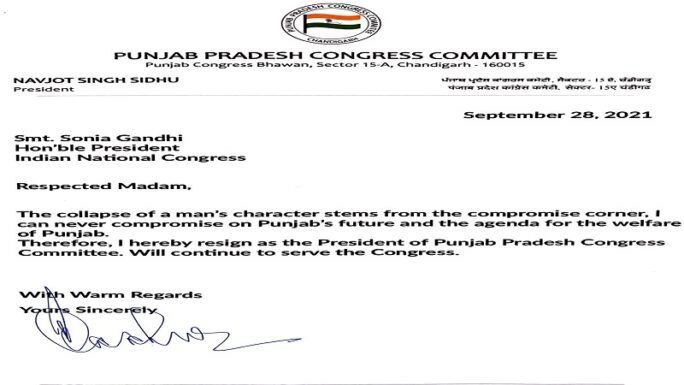 ਪੰਜਾਬ ਕਾਂਗਰਸ ਦੇ ਪ੍ਰਧਾਨ ਨਵਜੋਤ ਸਿੰਘ ਸਿੱਧੂ ਨੇ ਦਿੱਤਾ ਅਸਤੀਫਾ