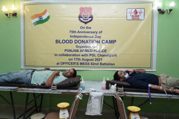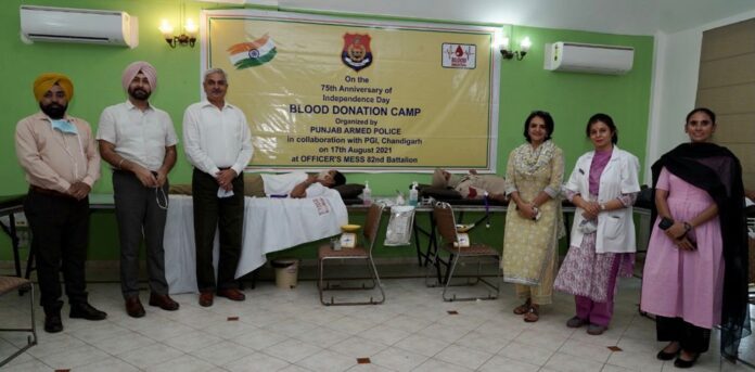 ‘ਅਜ਼ਾਦੀ ਕਾ ਅੰਮਿ੍ਰਤ ਮਹਾਂਉਤਸਵ’ ਤਹਿਤ 75ਵੇਂ ਆਜਾਦੀ ਦਿਵਸ ਦੇ ਚੱਲ ਰਹੇ ਜਸ਼ਨਾਂ ਦੇ ਹਿੱਸੇ ਵਜੋਂ 82ਵੀਂ ਅਤੇ 13ਵੀਂ ਬਟਾਲੀਅਨ, ਪੰਜਾਬ ਪੁਲਿਸ ਦੀ ਪੰਜਾਬ ਆਰਮਡ ਪੁਲਿਸ (ਪੀਏਪੀ) ਨੇ ਪੀ.ਜੀ.ਆਈ. ਚੰਡੀਗੜ ਦੇ ਸਹਿਯੋਗ ਨਾਲ ਮੰਗਲਵਾਰ ਨੂੰ ਇੱਥੇ ਖੂਨਦਾਨ ਕੈਂਪ ਲਗਾਇਆ।