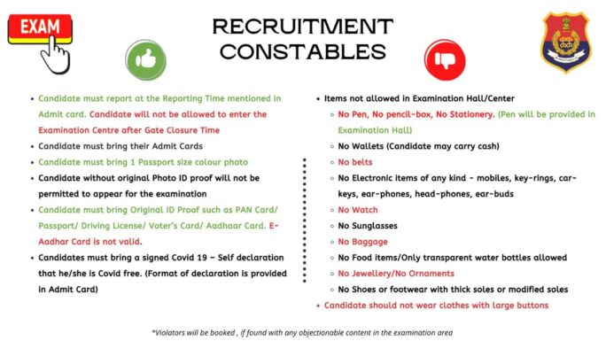ਏਡੀਜੀਪੀ-ਕਮ-ਕਾਂਸਟੇਬਲਾਂ ਲਈ ਕੇਂਦਰੀ ਭਰਤੀ ਬੋਰਡ ਦੀ ਚੇਅਰਪਰਸਨ ਗੁਰਪ੍ਰੀਤ ਕੌਰ ਦਿਓ ਨੇ ਦੱਸਿਆ ਕਿ ਜ਼ਿਲ੍ਹਾ ਅਤੇ ਆਰਮਡ ਕਾਡਰ ਵਿੱਚ ਕਾਂਸਟੇਬਲ ਦੀਆਂ 4358 ਅਸਾਮੀਆਂ ਲਈ 4,71,007 ਉਮੀਦਵਾਰਾਂ ਨੂੰ ਦਾਖਲਾ ਕਾਰਡ ਜਾਰੀ ਕਰ ਦਿੱਤੇ ਗਏ ਹਨ। ਉਨ੍ਹਾਂ ਕਿਹਾ ਕਿ 25 ਅਤੇ 26 ਸਤੰਬਰ 2021 ਨੂੰ ਹੋਣ ਵਾਲੀ ਲਿਖਤੀ ਪ੍ਰੀਖਿਆ ਦੋ ਸ਼ਿਫਟਾਂ ਵਿੱਚ ਲਈ ਜਾ ਰਹੀ ਹੈ, ਜਿਸ ਵਿੱਚ ਸਵੇਰੇ 10 ਵਜੇ ਤੋਂ ਦੁਪਹਿਰ 12 ਵਜੇ ਅਤੇ ਸ਼ਾਮ 3 ਵਜੇ ਤੋਂ ਸ਼ਾਮ 5 ਵਜੇ ਦੀਆਂ ਸ਼ਿਫਟਾਂ ਸ਼ਾਮਲ ਹਨ।