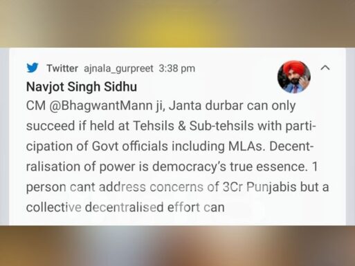 ਚੰਡੀਗੜ੍ਹ, 16 ਮਈ – ਨਵਜੋਤ ਸਿੰਘ ਸਿੱਧੂ ਵਲੋਂ ਟਵੀਟ ਕਰਕੇ ਮੁੱਖ ਮੰਤਰੀ ਭਗਵੰਤ ਮਾਨ ਨੂੰ ਲਿਖਿਆ ਗਿਆ ਹੈ ਕਿ ”ਜਨਤਾ ਦਰਬਾਰ ਤਾਂ ਹੀ ਸਫਲ ਹੋ ਸਕਦਾ ਹੈ ਜੇਕਰ ਤਹਿਸੀਲਾਂ ਅਤੇ ਸਬ-ਤਹਿਸੀਲਾਂ ਵਿਚ ਵਿਧਾਇਕਾਂ ਸਮੇਤ ਸਰਕਾਰੀ ਅਧਿਕਾਰੀਆਂ ਦੀ ਸ਼ਮੂਲੀਅਤ ਨਾਲ ਆਯੋਜਿਤ ਕੀਤਾ ਜਾਵੇ। ਸ਼ਕਤੀ ਦਾ ਵਿਕੇਂਦਰੀਕਰਨ ਲੋਕਤੰਤਰ ਦਾ ਅਸਲ ਤੱਤ ਹੈ। 1 ਵਿਅਕਤੀ 3 ਕਰੋੜ ਪੰਜਾਬੀਆਂ ਦੀਆਂ ਚਿੰਤਾਵਾਂ ਨੂੰ ਹੱਲ ਨਹੀਂ ਕਰ ਸਕਦਾ ਪਰ ਇਕ ਸਮੂਹਿਕ ਵਿਕੇਂਦਰੀਕਰਣ ਯਤਨ ਕਰ ਸਕਦਾ ਹੈ |