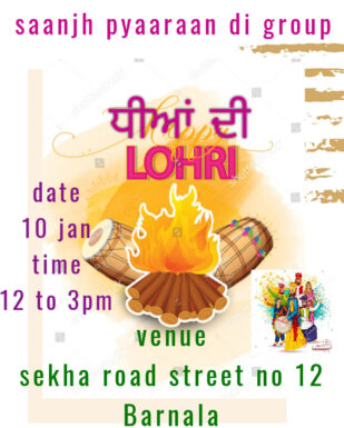 ਬਰਨਾਲਾ (ਕਰਨਪਰੀਤ ਧੰਦਰਾਲ) : “ਸਾਂਝ ਪਿਆਰਾਂ ਦੀ” ਗਰੁੱਪ ਬਰਨਾਲਾ ਵੱਲੋਂ 5ਵਾਂ ਧੀਆਂ ਦੀ ਲੋਹੜੀ ਪ੍ਰੋਗਰਾਮ ਜਨਵਰੀ 10 ਨੂੰ ਸੇਖਾ ਰੋਡ ਵਿਖੇ ਹਰ ਸਾਲ ਦੀ ਤਰ੍ਹਾਂ ਧੂਮ-ਧਾਮ ਨਾਲ ਮਨਾਇਆ ਜਾ ਰਿਹਾ ਹੈ। ਇਸ ਸਬੰਧੀ ਜਾਣਕਾਰੀ ਦਿੰਦਿਆਂ ਗਰੁੱਪ ਦੇ ਐਡਮਿਨ ਡਾਕਟਰ ਕੁਲਵਿੰਦਰ ਸਿੰਘ ਧੰਦਰਾਲ ਮੀਡੀਆ ਸਲਾਹਕਾਰ ਅਮਨਦੀਪ ਕੌਰ, ਕਿਰਨਦੀਪ ਕੌਰ ਧੰਦਰਾਲ, ਭੁਪਿੰਦਰ ਕੌਰ ਧਾਲੀਵਾਲ ਪੀ.ਐਸ.ਪੀ.ਸੀ ਐਲ, ਜਸਪਰੀਤ ਕੌਰ ਪੰਡੋਰੀ ਨੇਂ ਦੱਸਿਆ ਕਿ ਧੀਆਂ ਨੂੰ ਪੁੱਤਾਂ ਦੇ ਬਰਾਬਰ ਦਰਜਾ ਦਿੰਦਿਆਂ ਹਰ ਸਾਲ ਦੀ ਤਰ੍ਹਾਂ ਕਰਵਾਇਆ ਜਾ ਰਿਹਾ ਹੈ ਜਿਸ ਵਿੱਚ ਘਰਾਂ ਚ ਨਵਜੰਮੀਆਂ ਧੀਆਂ ਦੇ ਸਗਨ ਮਨਾਏ ਜਾਂਦੇ ਹਨ ਗਿੱਧੇ ਬੋਲੀਆਂ ਤੇ ਪੂਰੇ ਚਾਵਾਂ ਨਾਲ ਉਨ੍ਹਾਂ ਦੀਆਂ ਘੋੜੀਆਂ ਗਾਈਆਂ ਜਾਂਦੀਆਂ ਹਨ। ਪੜ੍ਹਾਈ ਤੇ ਹੋਰ ਖੇਤਰਾਂ ਚ ਮੱਲਾਂ ਮਾਰਨ ਵਾਲੀਆਂ ਧੀਆਂ ਨੁੰ ਸਨਮਾਨਿਤ ਕੀਤਾ ਜਾਵੇਗਾ। ਜਿਸ ਵਿੱਚ ਹੁਮ-ਹੁੰਮਾਂ ਕੇ ਪੁੱਜਣ ਦਾ ਖੁੱਲਾ ਸੱਦਾ ਦਿੱਤਾ ਜਾਂਦਾ ਹੈ।