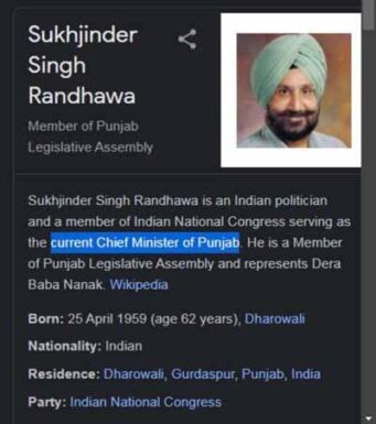 ਗੂਗਲ ‘ਤੇ ਸੁਖਜਿੰਦਰ ਸਿੰਘ ਰੰਧਾਵਾ ਨਾਂ ਦਾ ਨਾਂ ਸਰਚ ਕਰਨ ‘ਤੇ ‘ਵਿਕੀਪੀਡੀਆ’ ‘ਤੇ ਰੰਧਾਵਾ ਦੇ ਨਾਂ ਨਾਲ ‘ਕਰੰਟ ਚੀਫ ਮਨਿਸਟਰ ਆਫ਼ ਪੰਜਾਬ’ ਲਿਖਿਆ ਆ ਰਿਹਾ ਹੈ। ਰਸਮੀ ਤੌਰ ‘ਤੇ ਐਲਾਨ ਹੋਣ ਤੋਂ ਪਹਿਲਾਂ ਹੀ ਵਿੱਕੀਪੀਡੀਆ ਵੱਲੋਂ ਰੰਧਾਵਾ ਨੂੰ ਪੰਜਾਬ ਦਾ ਮੁੱਖ ਮੰਤਰੀ ਐਲਾਨ ਦੇਣਾ ਚਰਚਾ ਦਾ ਵਿਸ਼ਾ ਬਣ ਗਿਆ ਹੈ।